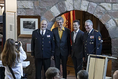 Im Rahmen der Verabschiedung würdigte Christian Herrmann, Bauftragter der THW-historischen Sammlung und Vizepräsident der THW-Bundesvereinigung, Schambergers Engagement, indem er ihm das Ehrenabzeichen der THW-Präsidentin Sabine Lackner verlieh. Diese besondere Auszeichnung unterstreicht die herausragende Leistung Schambergers, der als Beauftragter der THW-historischen Sammlung maßgeblich zur Verwirklichung des gemeinsamen Museums beitrug.