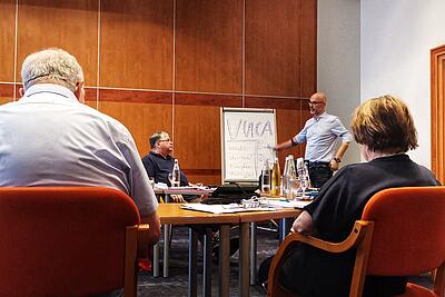 Diese und andere Fragen wurden in vielen Gesprächen erläutert und diskutiert. Zu diesem Treffen hatte die THW-BV alle Beteiligten eingeladen. In den vergangenen Monaten konnte der Veränderungsprozess nur per Video- und Telefonkonferenzen begleitet werden. Ein persönliches Treffen - um offene Punkte zu besprechen, Visionen zu erläutern und mögliche Missverständnisse direkt aus dem Weg zu räumen - war THW-BV Vizepräsident Christian Herrmann ein wichtiges Anliegen. Aber nicht nur ihm, sondern auch der THW-Leitung. Nicolas Hefner, Referatsleiter EA1 und seine Mitarbeiterin Monika Lieberam kamen nach Fulda und ins Gespräch mit vielen langjährigen Angehörigen der THWhS. Nicolas Hefner appellierte gleich zu Beginn für einen offenen und transparenten Umgang miteinander.